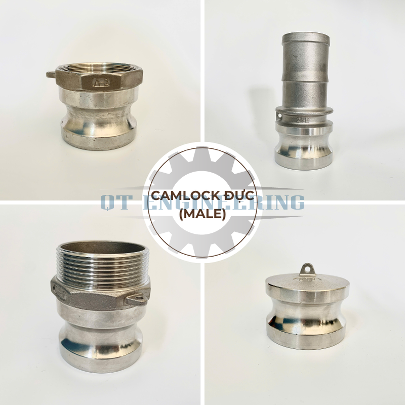 Các loại camlock kiểu đực, hay còn gọi là đầu đực (male), được dùng để kết nối với các đầu cái (female) để tạo thành khớp nối hoàn chỉnh. Kiểu đực gồm có Loại A (ren trong), Loại E (đuôi chuột), Loại F (ren ngoài), và Loại DP (nắp bịt), được sử dụng để kết nối ống hoặc hệ thống công nghiệp một cách nhanh chóng và hiệu quả.