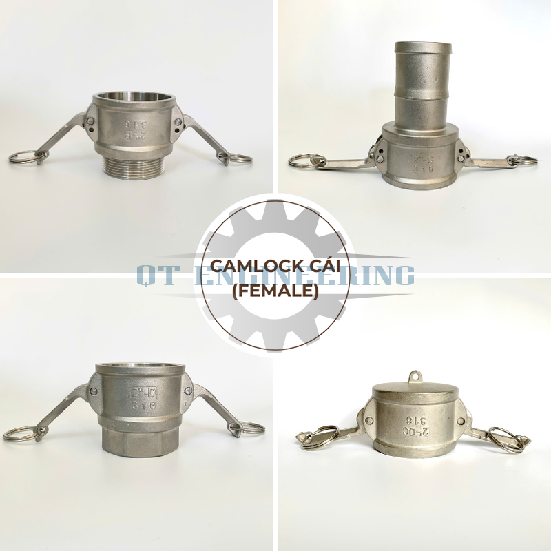 Các loại camlock kiểu cái, hay còn gọi là đầu cái (female), có 2 tai khóa dùng để kẹp vào đường rãnh trên đầu đực (male) để tạo thành khớp nối hoàn chỉnh. Kiểu cái gồm có Loại B (ren ngoài), Loại C (đuôi chuột), Loại D (ren trong), và Loại DC (nắp bịt), được sử dụng để kết nối ống hoặc hệ thống công nghiệp một cách nhanh chóng và hiệu quả.